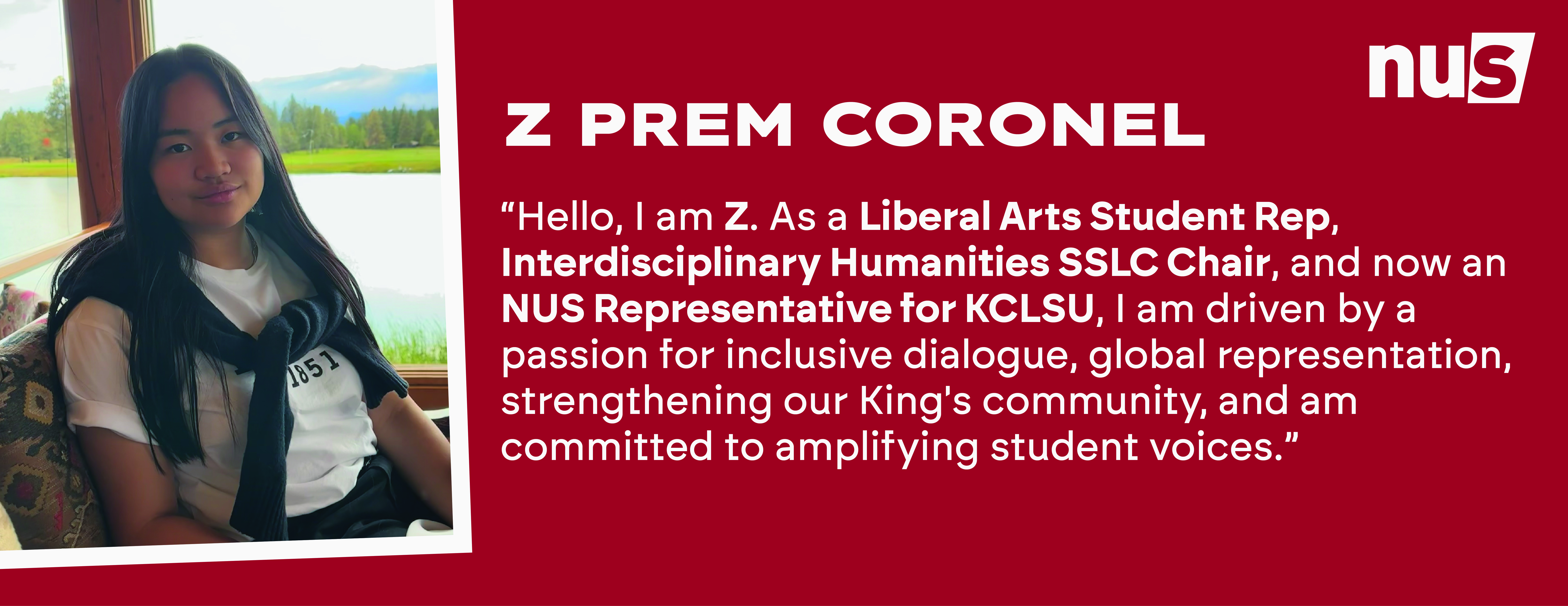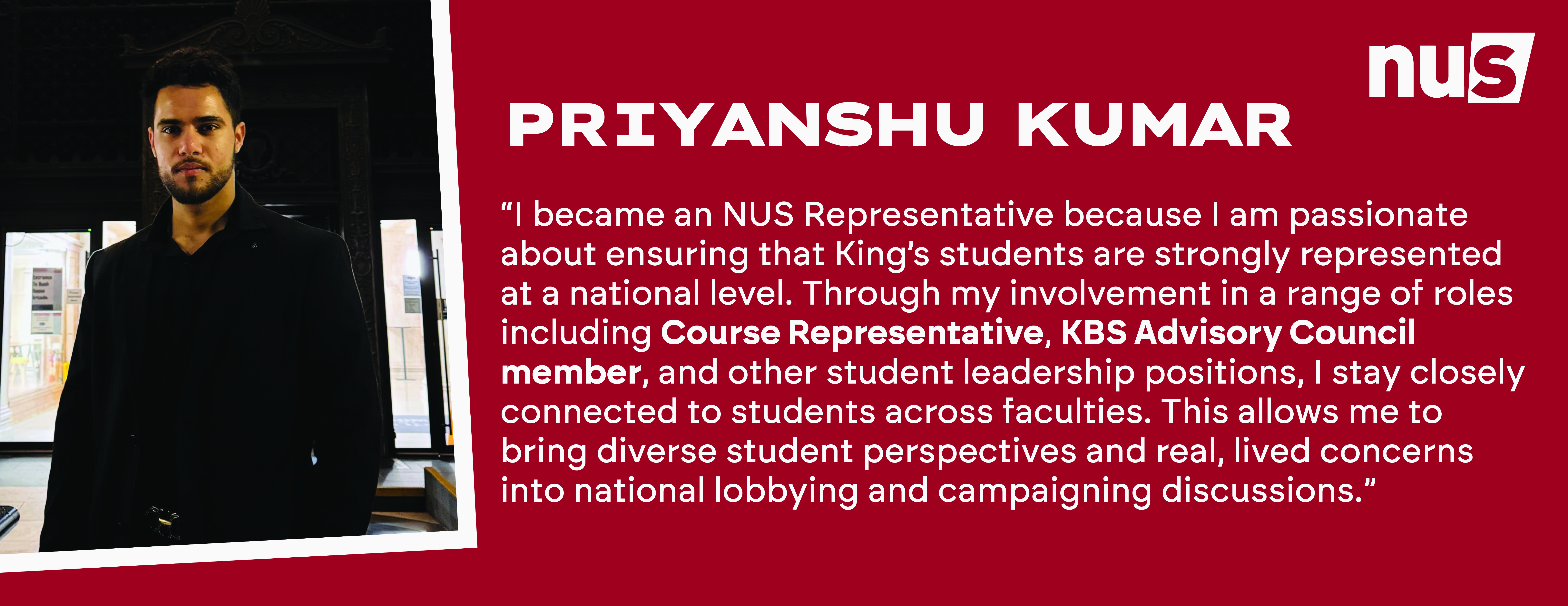 At King’s, four students lead on this work through their role as NUS Reps. Your NUS Reps all hold existing representative roles, such as academic reps, trustees or campaign leads. Their experience in these roles enables them to bring diverse perspectives and priorities from King’s students to the national level!
